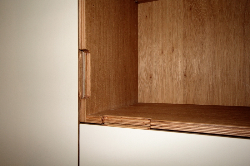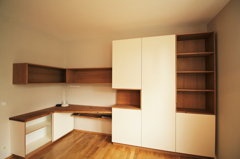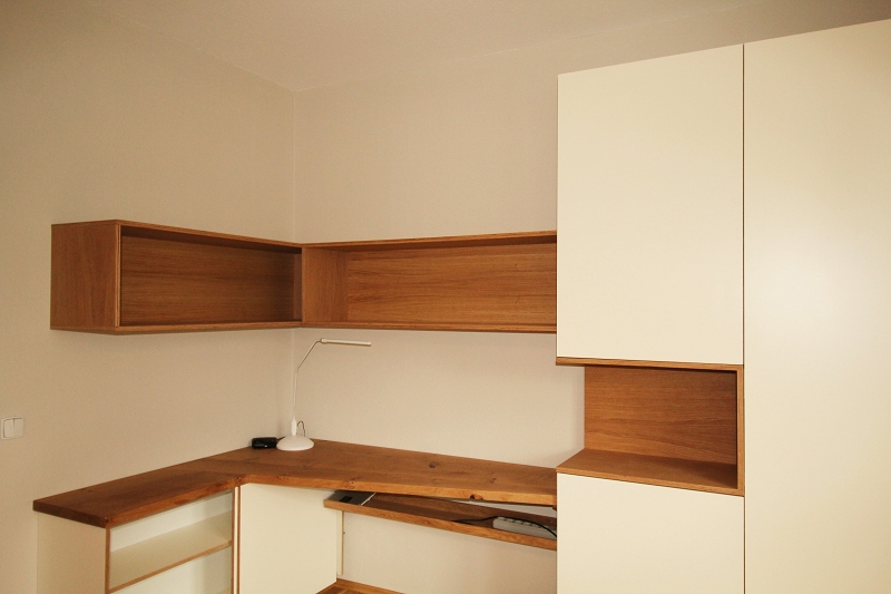 Die Fronten des Einbauschrankes sind weiß und Griff los, als Kontrast sind die offenen Bereiche so wie der Schreibtisch aus Eiche.
