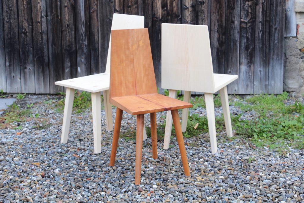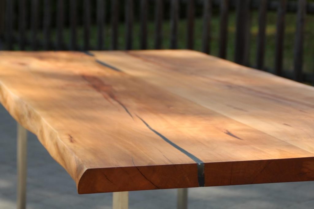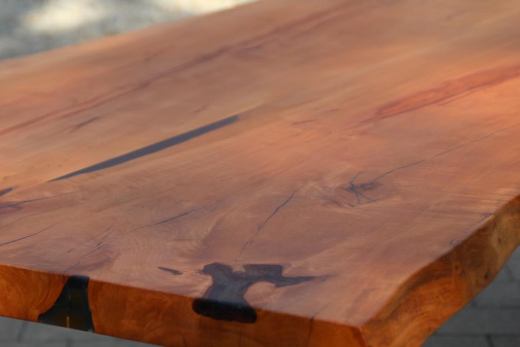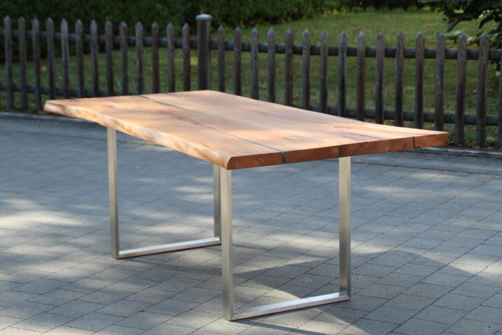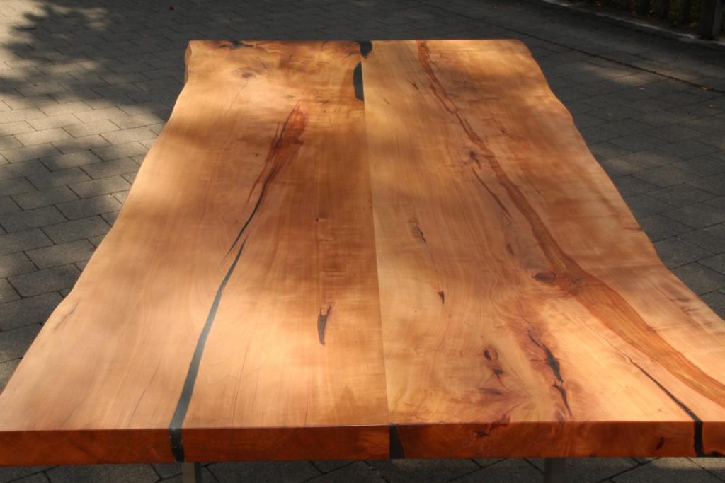 Die Tischplatte ist aus Birnbaum und der Baum stand mal in Kluftern.
