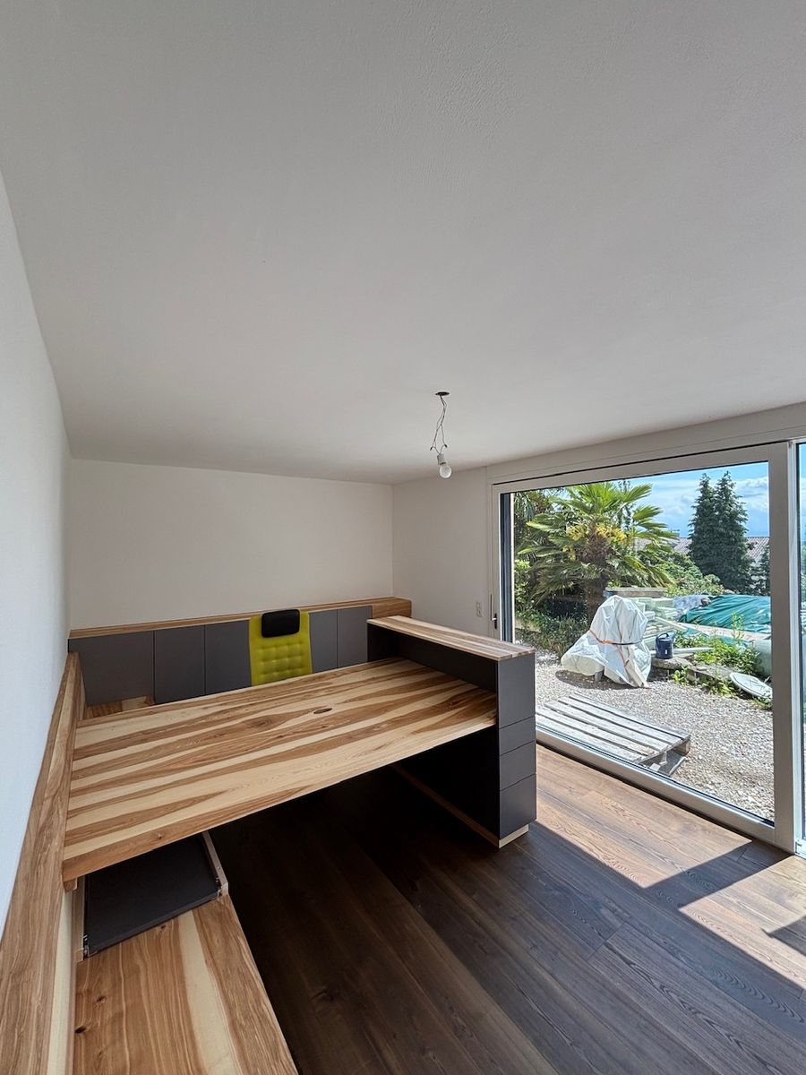 Diesen besonderen Raum durften wir mit viel Liebe zum Detail gestalten und umsetzen. Entstanden ist ein gemütliches, funktionales Büro mit zwei Arbeitsplätzen – genau abgestimmt auf die Wünsche der Bauherren.