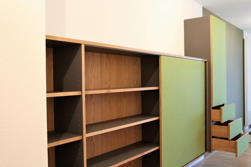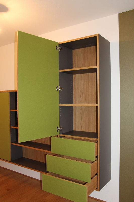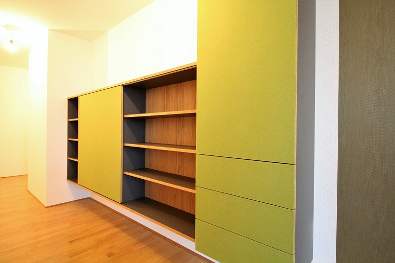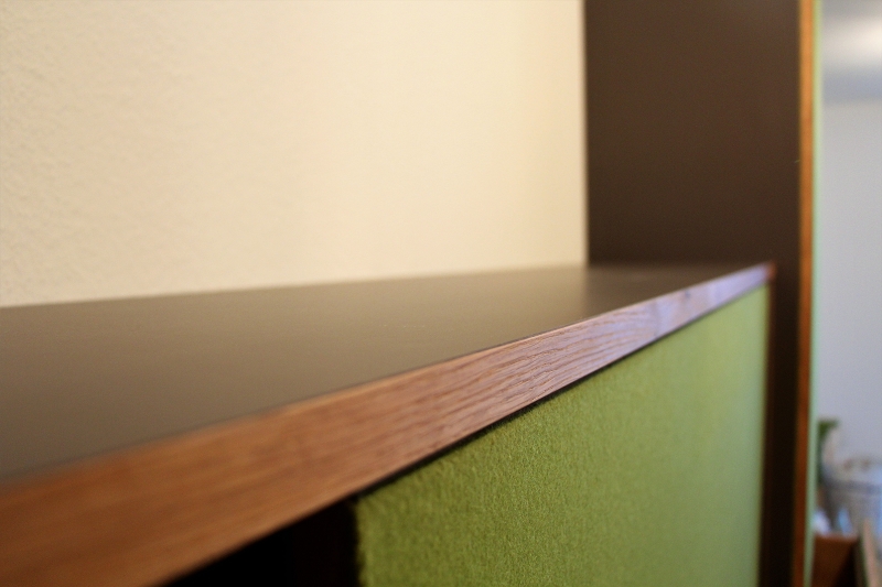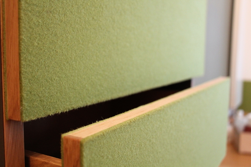 Die Fronten dieses Möbelstückes sind mit Wollfilz belegt. Dahinter verbirgt sich die Kombination aus matt grauem Schichtstoff und Eiche.