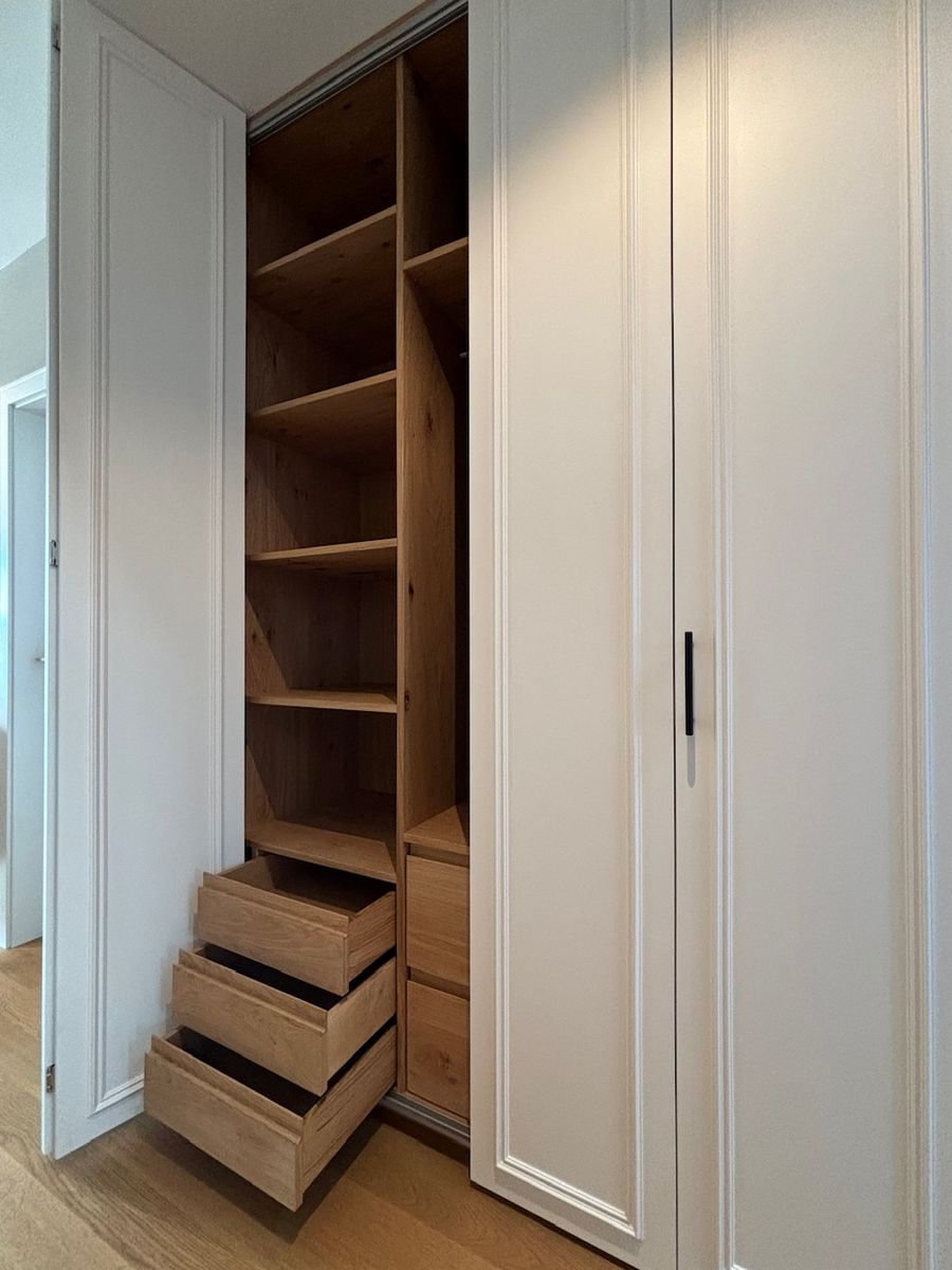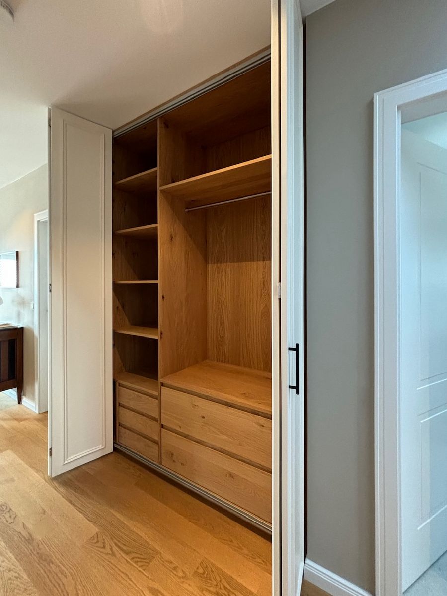 Innen besteht sie aus Eiche und bietet viel Stauraum. Es gibt offene Regale, eine Kleiderstange und Schubladen – ideal, um Kleidung und Accessoires ordentlich zu verstauen. Ein stilvolles Möbelstück, das gut aussieht und den Alltag erleichtert.