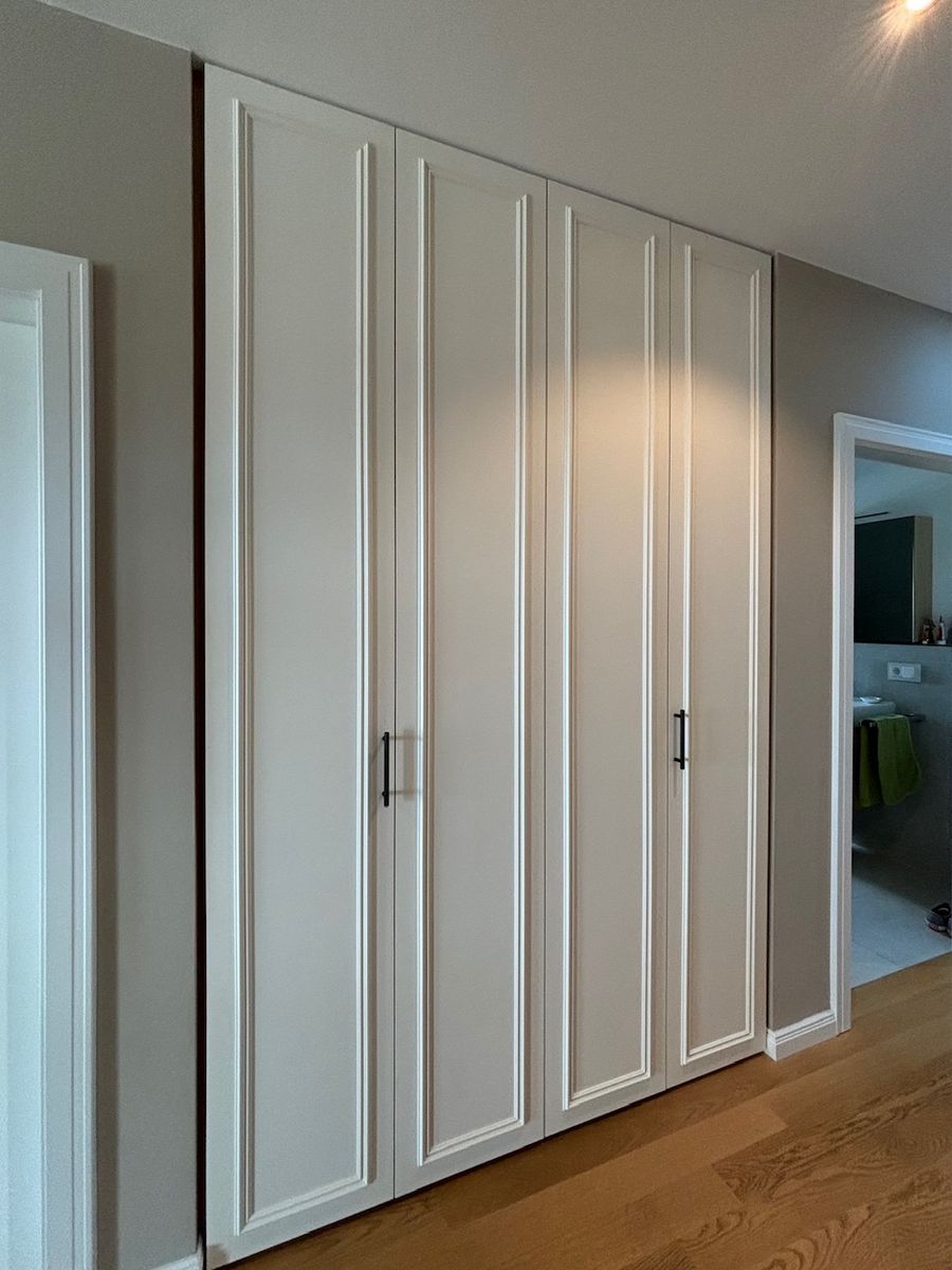 Diese Garderobe ist elegant und praktisch zugleich. Die weißen Türen mit Zierleisten verleihen ihr einen klassischen Look.