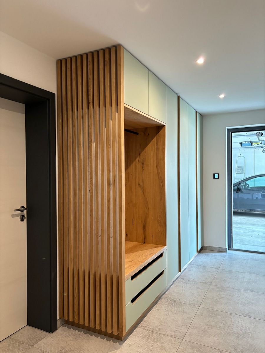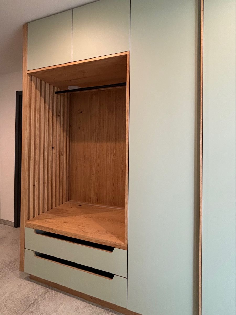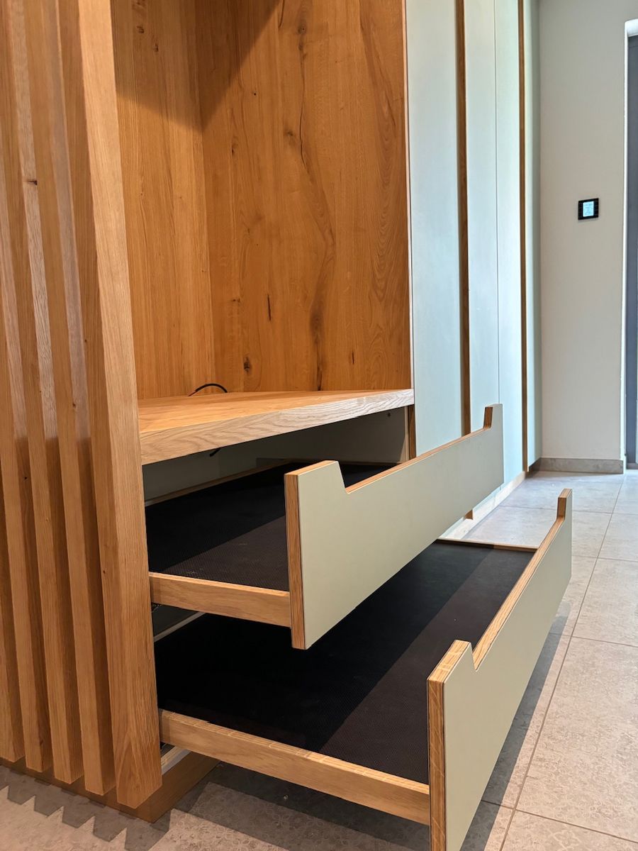 Linoleum belegte Türen, ausziehbare Schuhfächer, leisten Sichtschutz zur offenen Garderobenstange, schmale Schattenfuge zur Decke.