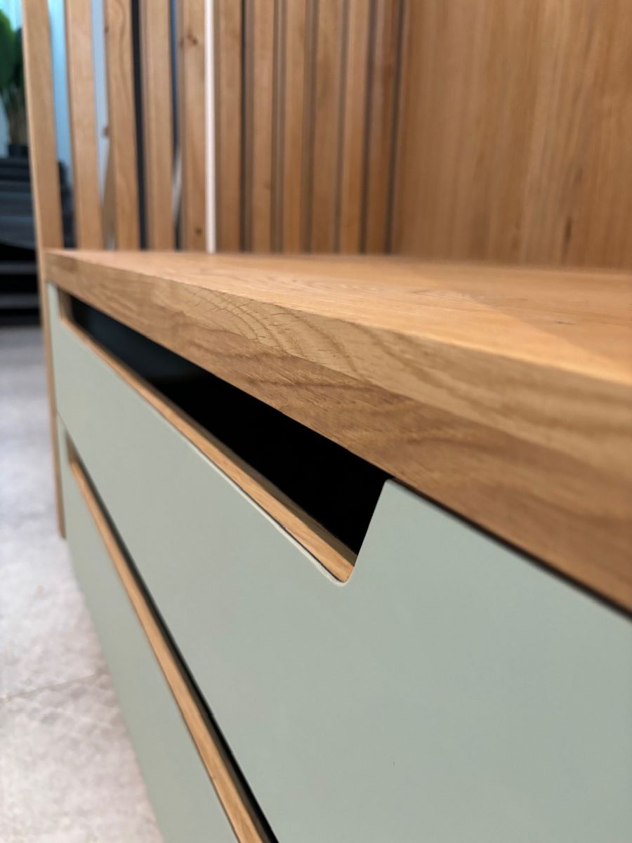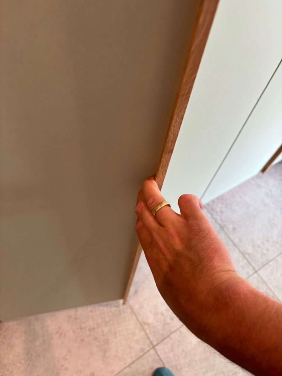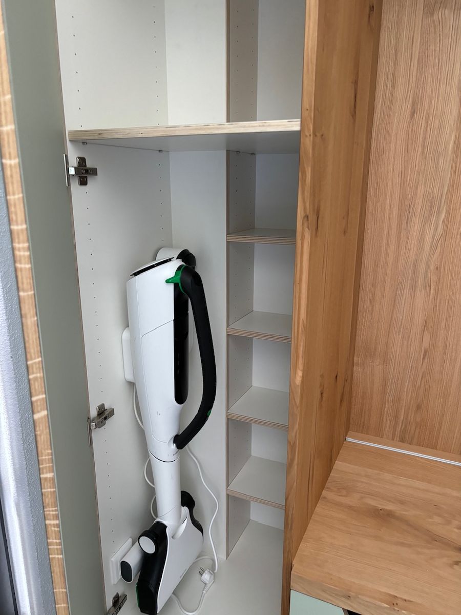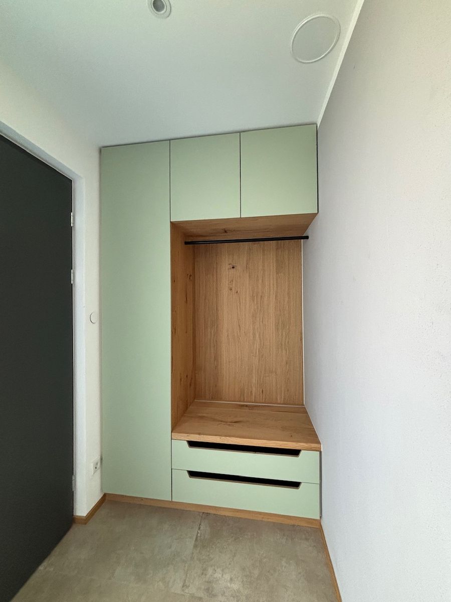 Linoleum belegte Türen, ausziehbare Schuhfächer, leisten Sichtschutz zur offenen Garderobenstange, schmale Schattenfuge zur Decke.