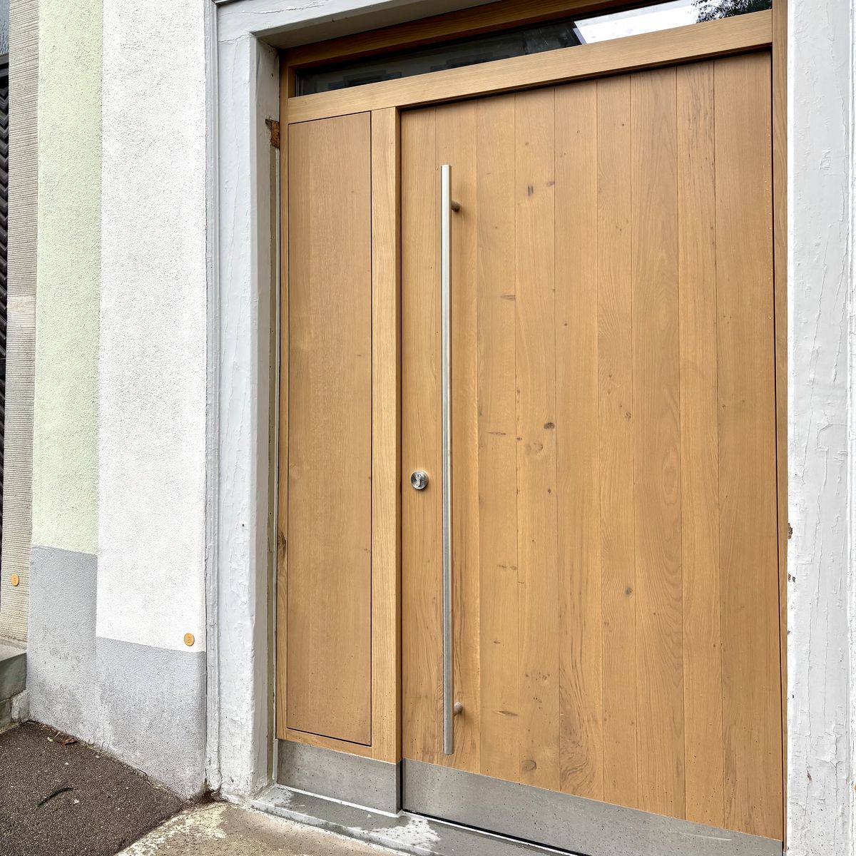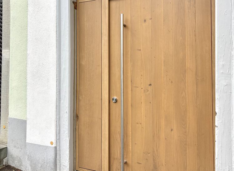 Wir gestalteten und konstruierten eine stabile und robuste Eingangstüre, die sich harmonisch in das Gesamtbild des historischen Gebäudes einfügt.