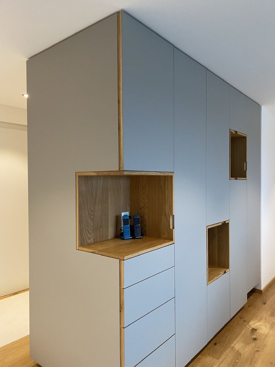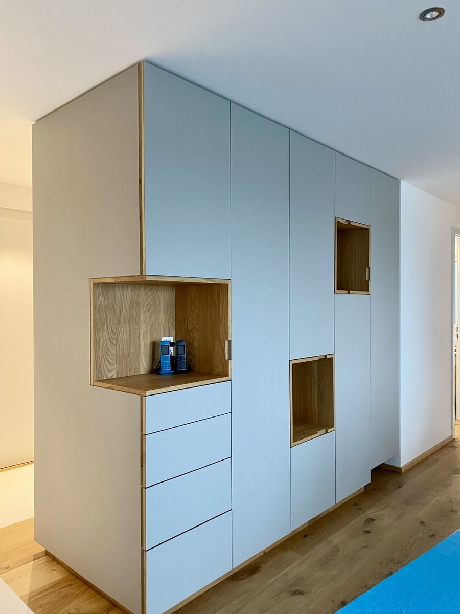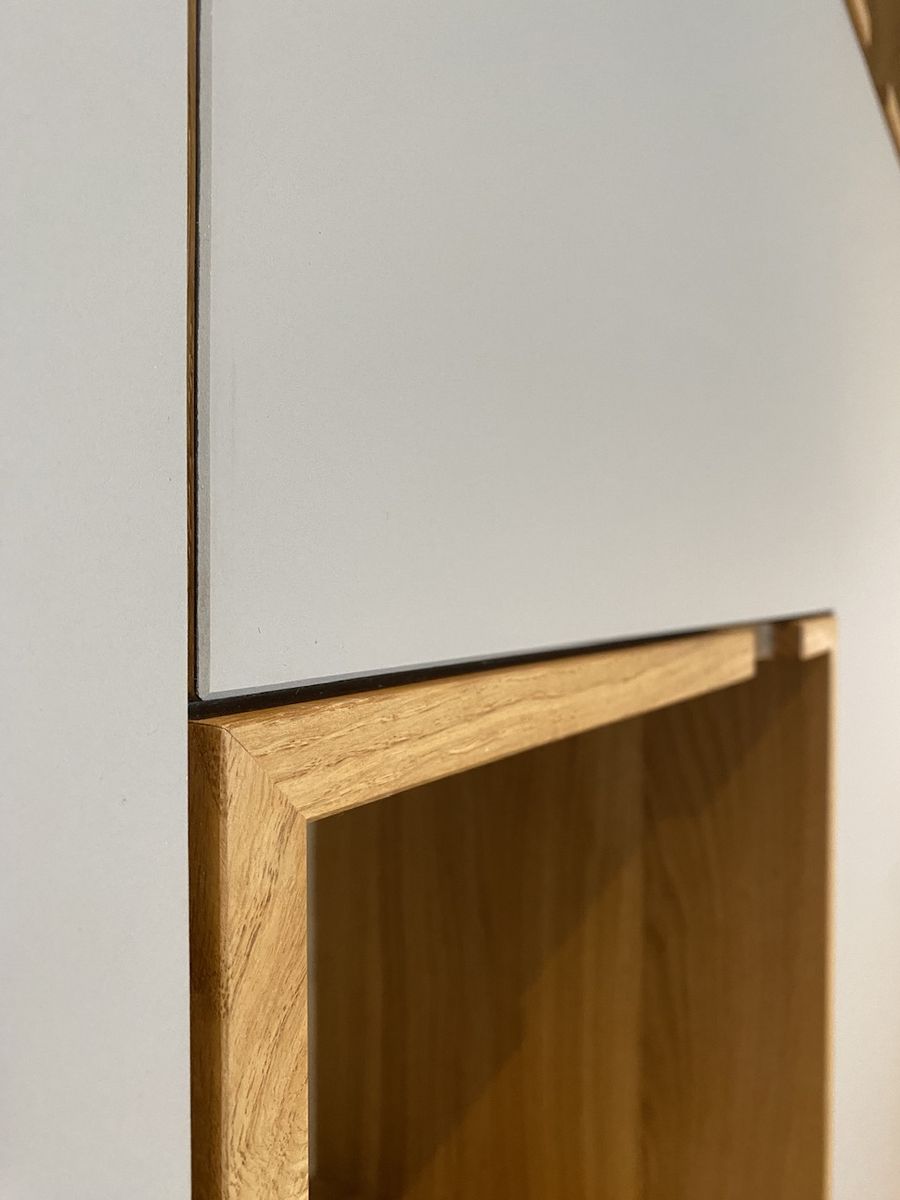 - Die Fronten des Raumteilers sind mit hochwertigem Linoleum der Firma Forbo belegt. Linoleum ist ein nachhaltiges Material, das strapazierfähig, pflegeleicht und in vielen ansprechenden Farben erhältlich ist.