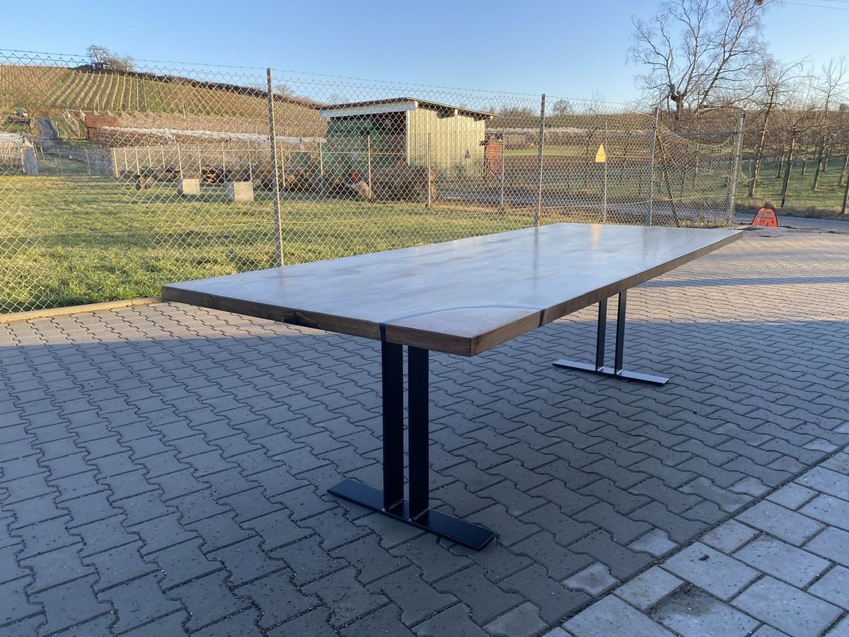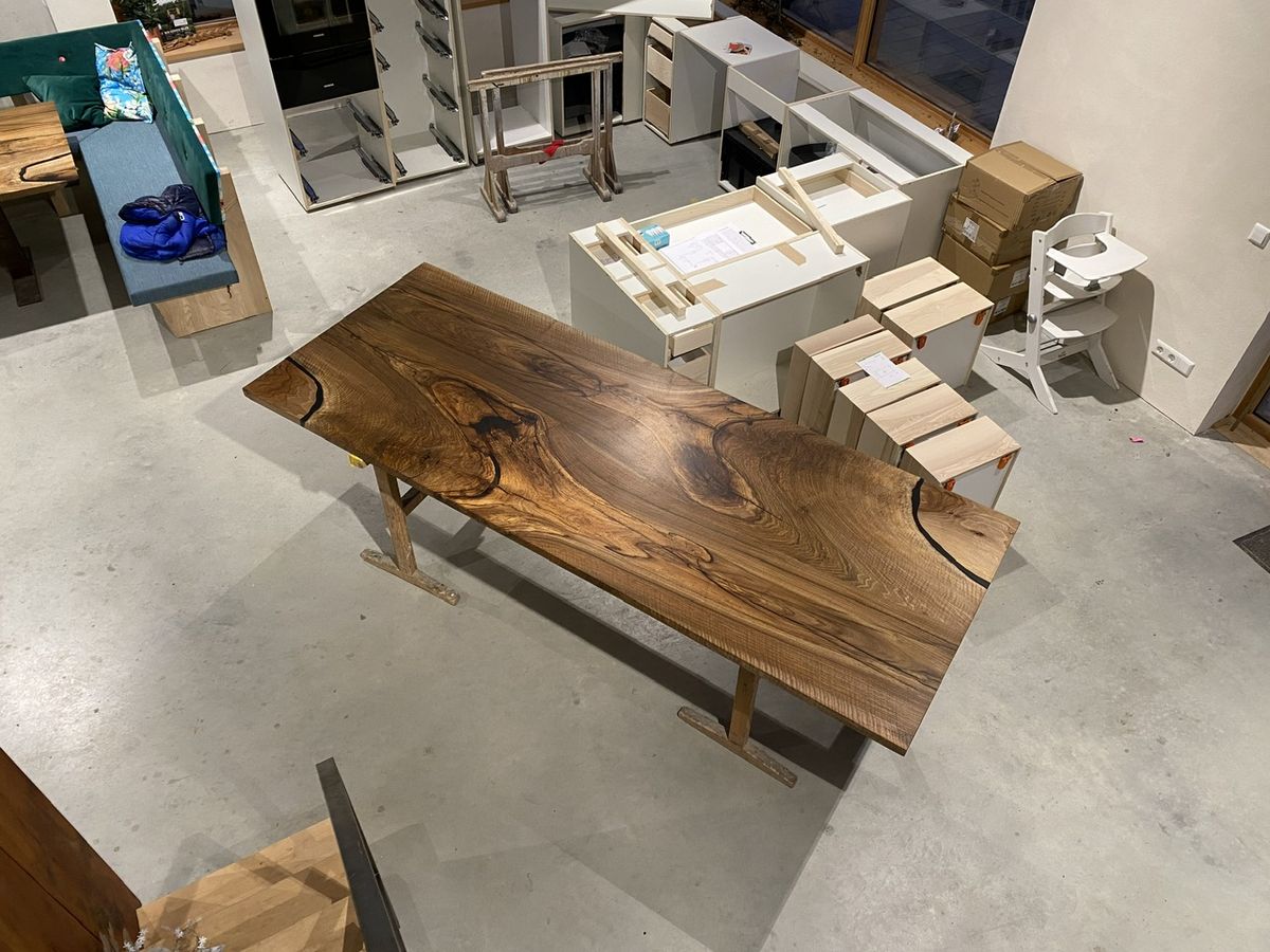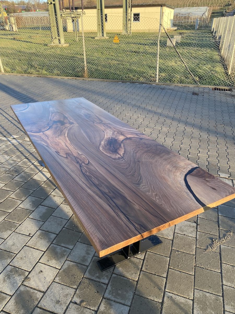 Einer unserer Highlights ist dieser schöne Esstisch aus Nussbaum. die Platte ist 3,2m lang und 40mm stark.