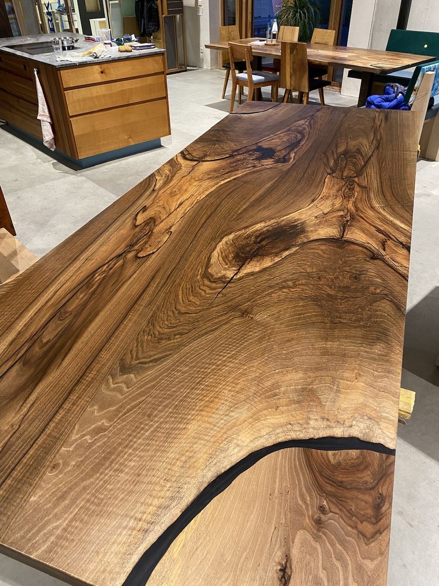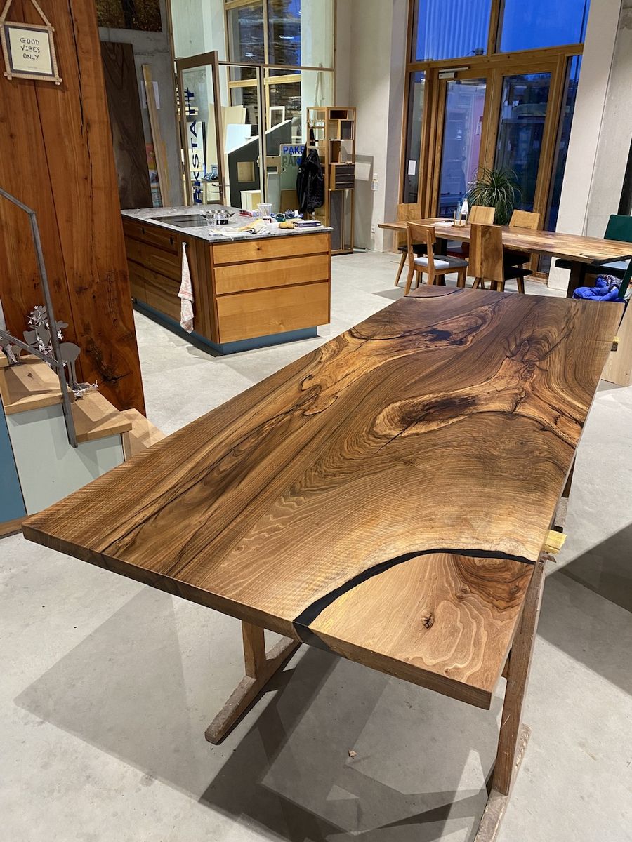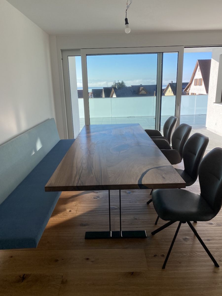 Einer unserer Highlights ist dieser schöne Esstisch aus Nussbaum. die Platte ist 3,2m lang und 40mm stark.