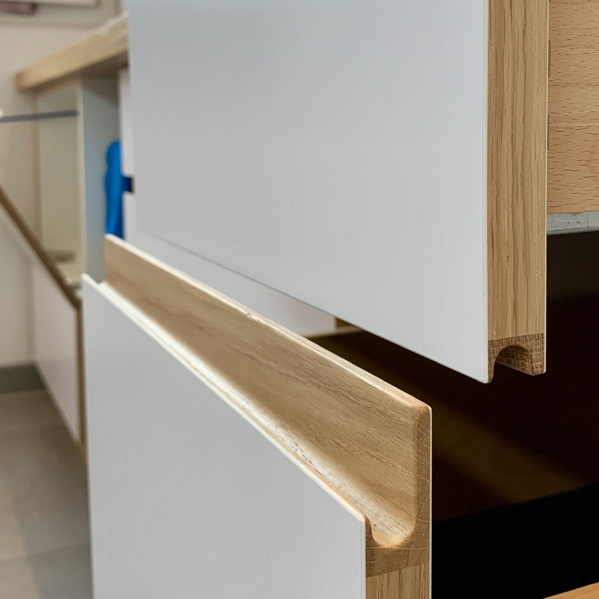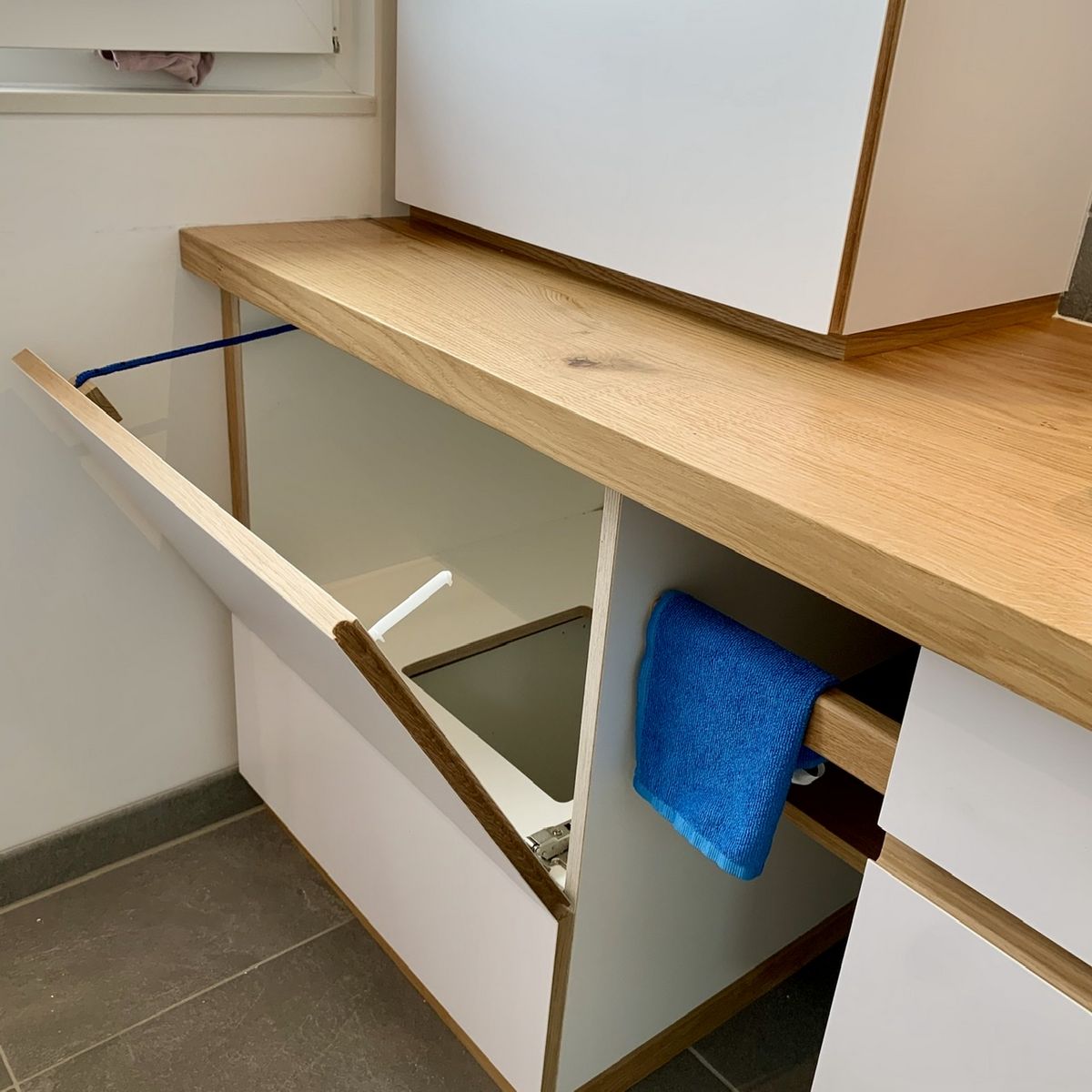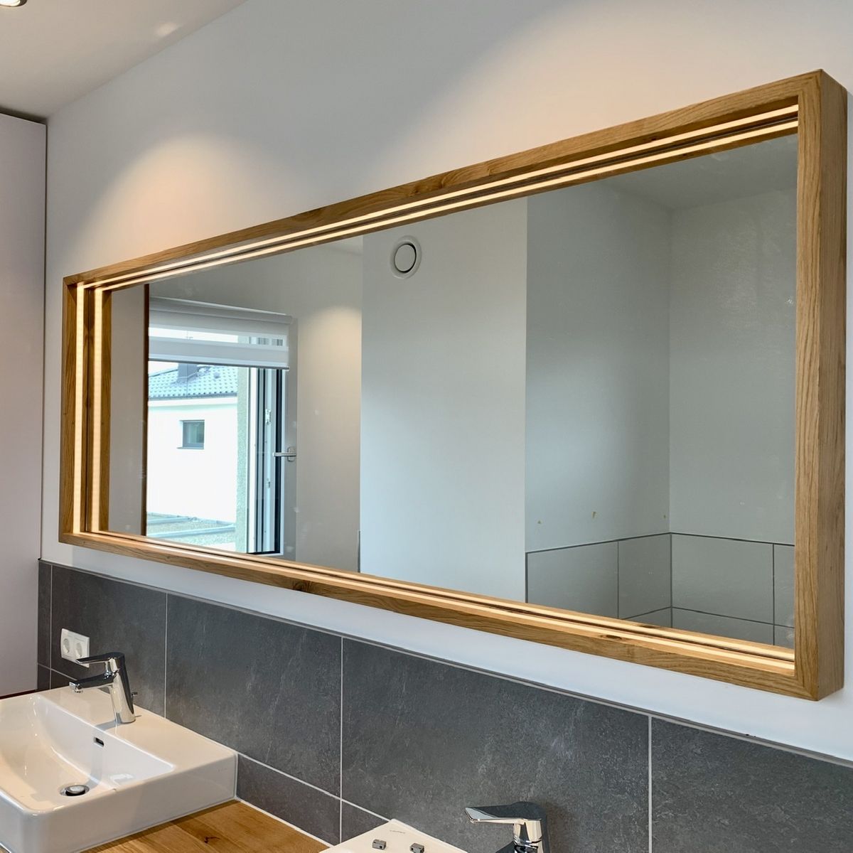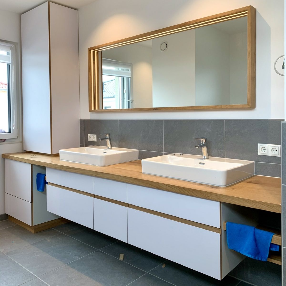 Ein drei Meter langer Waschtisch aus Eiche mit viel Stauraum, einer Wäscheabwurf Klappe und einem passendem Spiegel. Das gibts nur beim Schreiner.