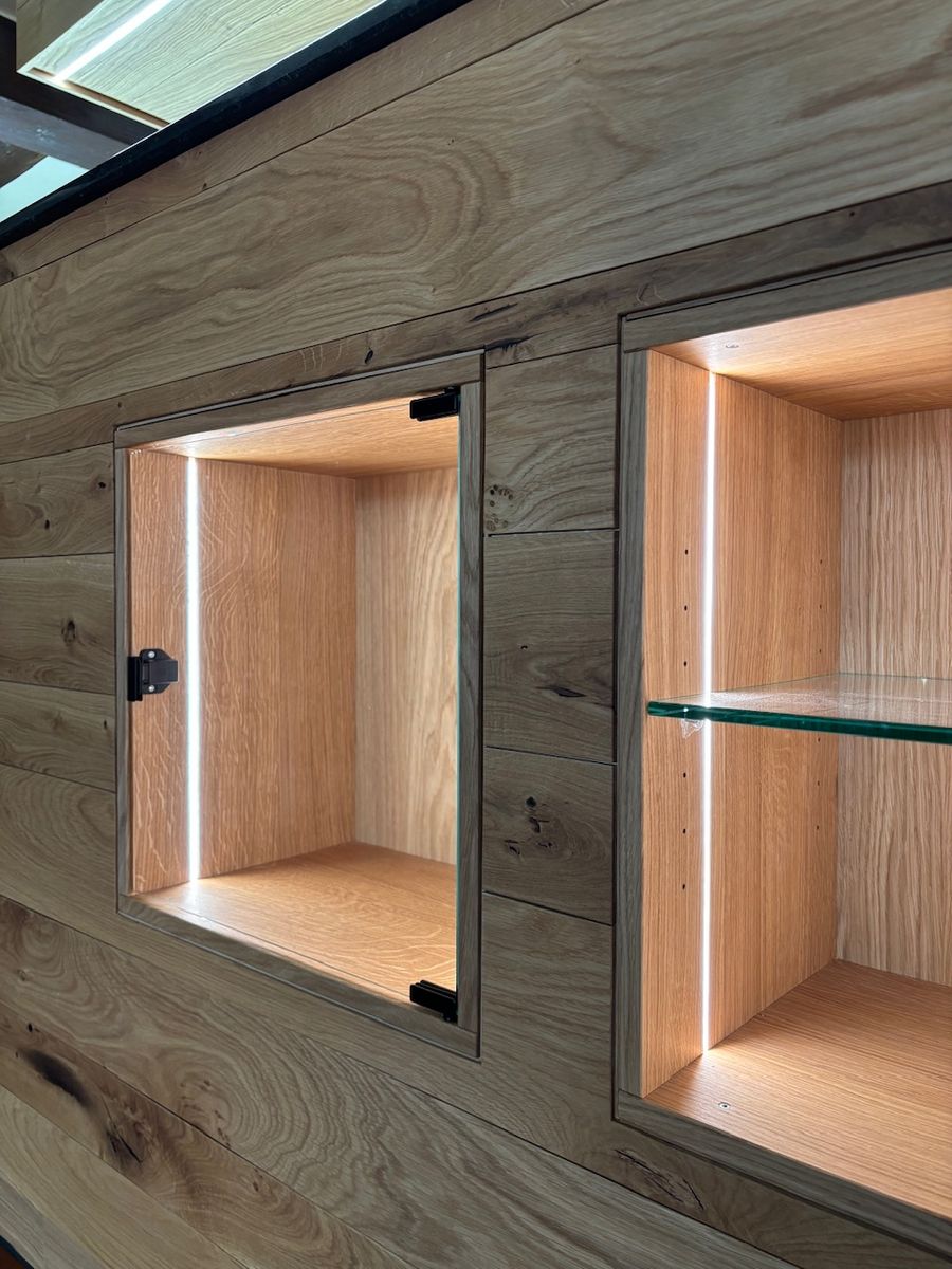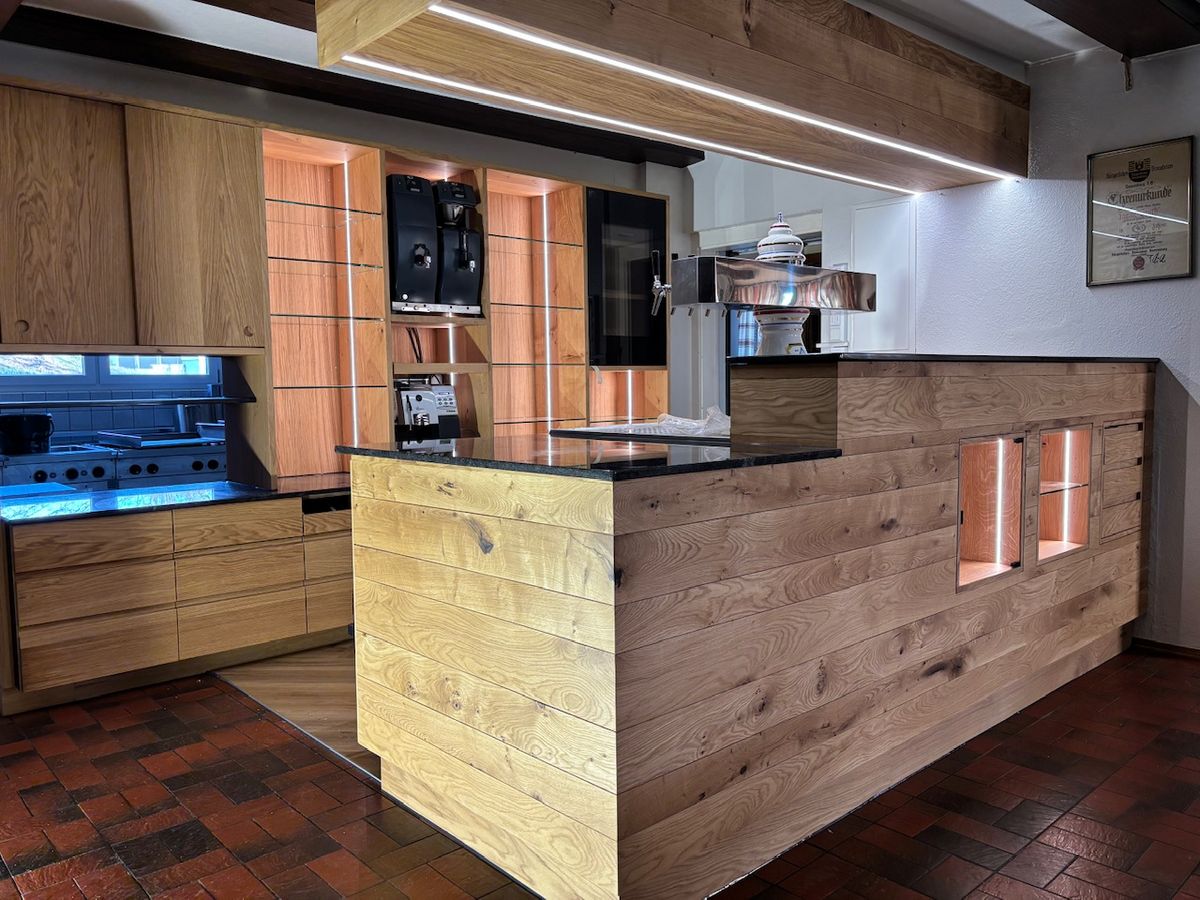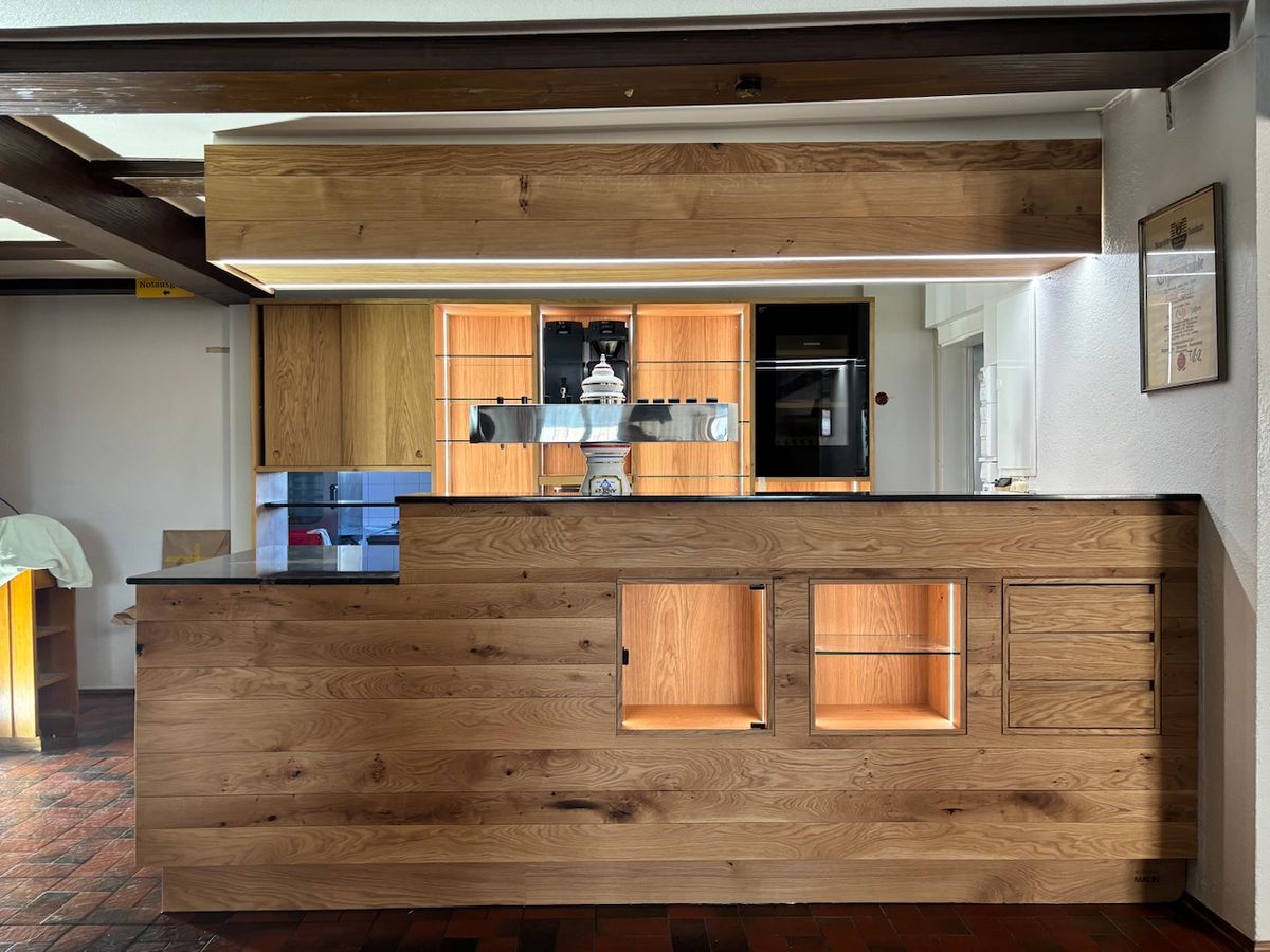 Für die Fertigung erstellten wir einen präzisen Plan und arbeiteten eng mit den anderen Gewerken, wie Elektrikern und Thekenbauern, zusammen, um eine reibungslose Umsetzung zu gewährleisten. Das Ergebnis ist eine Theke, die den Charme der Vergangenheit bewahrt und gleichzeitig modernste Funktionalität bietet.