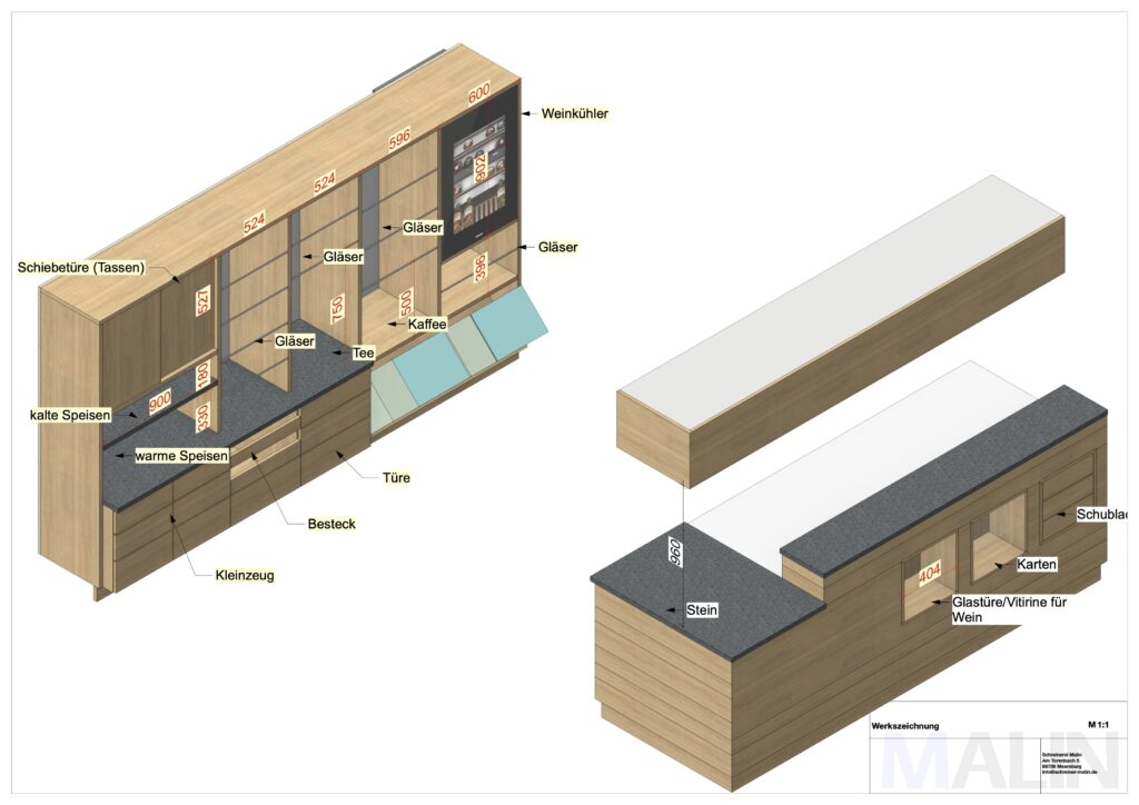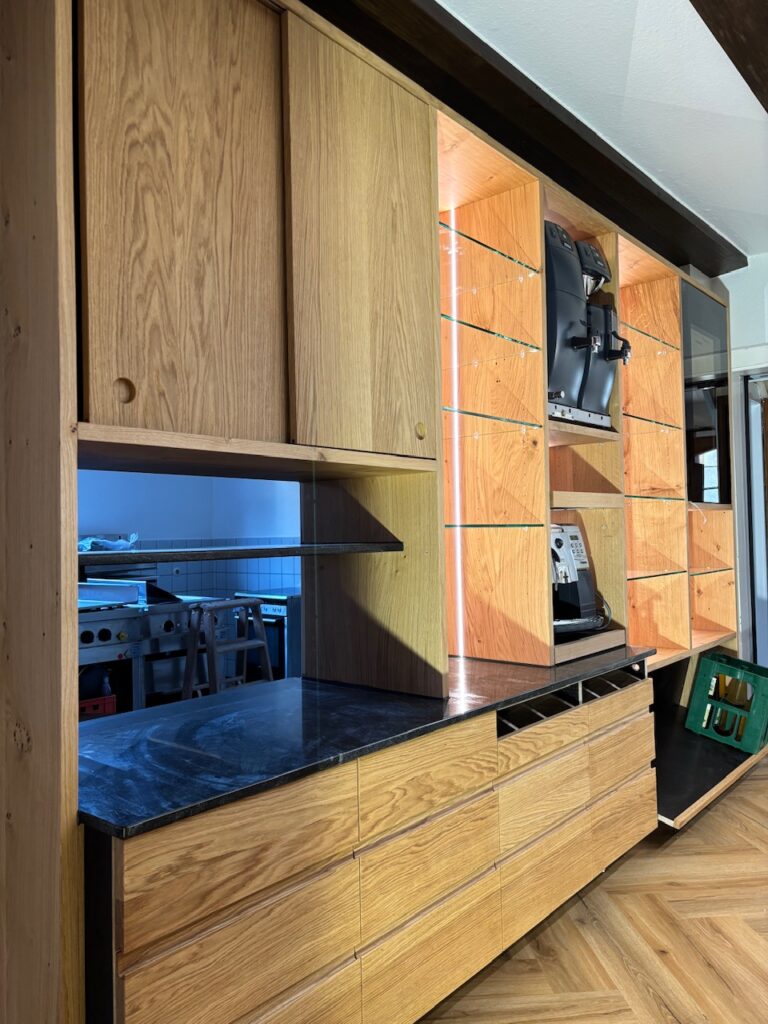 Nach einer sorgfältigen Analyse der Arbeitsabläufe und der spezifischen Anforderungen an der Theke begannen wir mit der Gestaltung und Konstruktion. Unser Ziel war es, eine Einrichtung zu schaffen, die sowohl ästhetisch als auch praktisch ist und das historische Ambiente respektvoll ergänzt.